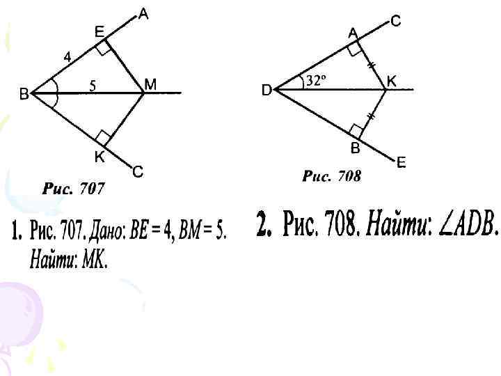Серединный перпендикуляр к отрезку Теорема 1. Каждая точка серединного перпендикуляра к отрезку Р равноудалена от его концов. М А К Дано: АВ – отрезок, РК – серединный перпендикуляр, М є РК В Доказать: МА = МВ Теорема 2. Точка, равноудалённая от концов отрезка, лежит на серединном перпендикуляре к нему. Обобщённая теорема: серединный перпендикуляр к отрезку – множество точек плоскости, равноудалённых от его концов.