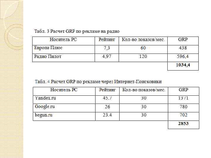 Табл. 1 Расчет GRP по наружной рекламе Табл. 2 Расчет GRP по рекламе в прессе