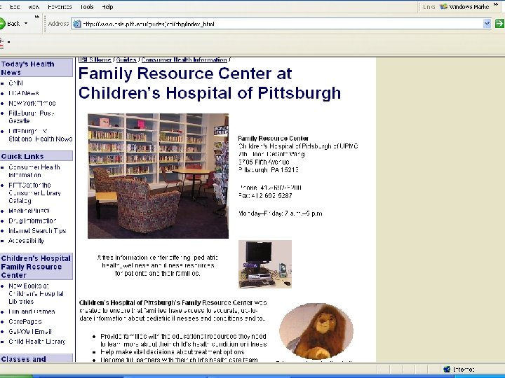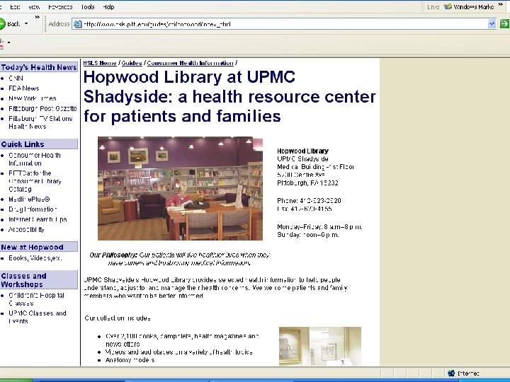 Consumer health & patient education services n n n Specialized libraries affiliated with large medical and hospital libraries Special sections in public libraries Virtual web-based libraries