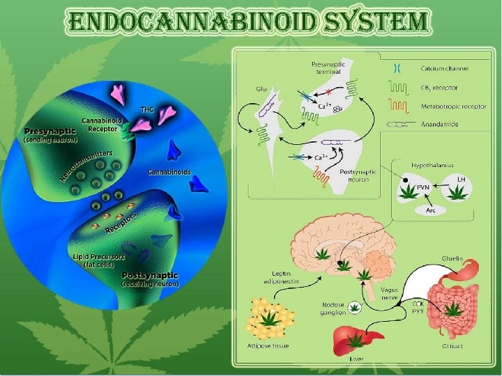 Cannabinoid Drugs 1986 • • • delta-9 -Tetrahydrocannabinol (Δ 9 -THC, THC) and delta-8 -tetrahydrocannabinol (Δ 8 THC), mimic the action of anandamide. The THCs produce the high associated with cannabis by binding to the CB 1 cannabinoid receptors in the brain. Cannabidiol (CBD), non-psychoactive. CBD has anti-inflammatory effects. CBD shares a precursor with THC and is the main cannabinoid in low-THC Cannabis strains. Cannabinol (CBN), a degradation product of THC, produces a depressant effect.