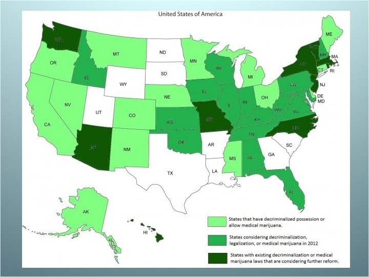 ANA Position Statement on Medical Marijuana 1. The education of registered nurses and other health care practitioners regarding appropriate evidence-based therapeutic use of marijuana including those nonsmoked forms of delta-9 -tetrahydrocannabinol (THC) that have proven to be therapeutically efficacious 2. Protection from criminal or civil penalties for patients using medical marijuana as permitted under state laws 3. Exemption from criminal prosecution; civil liability; or professional sanctioning, such as loss of licensure or credentialing, for health care practitioners who prescribe, dispense or administer medical marijuana in accordance with state law. 4. Reclassification of marijuana’s status from a Schedule I controlled substance into a less restrictive category. 5. Confirmation of therapeutic efficacy of medical marijuana.