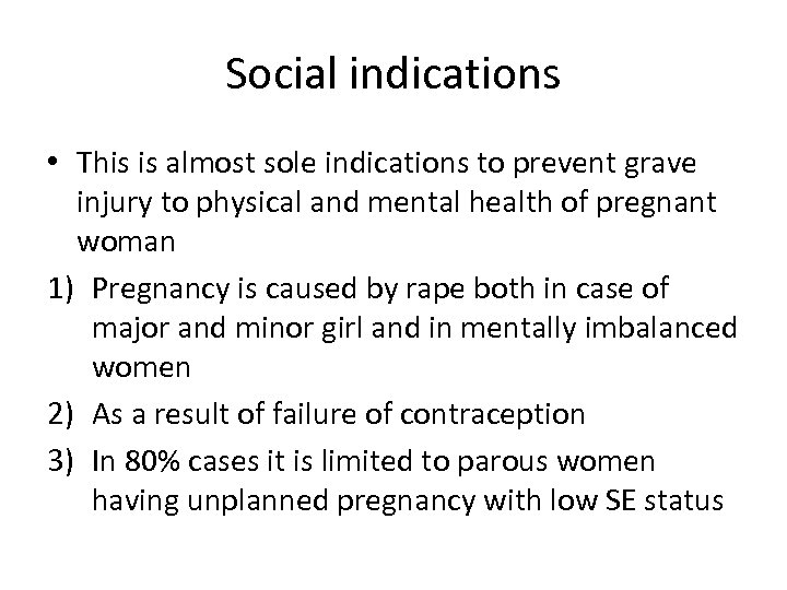 Social indications • This is almost sole indications to prevent grave injury to physical and mental health of pregnant woman 1) Pregnancy is caused by rape both in case of major and minor girl and in mentally imbalanced women 2) As a result of failure of contraception 3) In 80% cases it is limited to parous women having unplanned pregnancy with low SE status