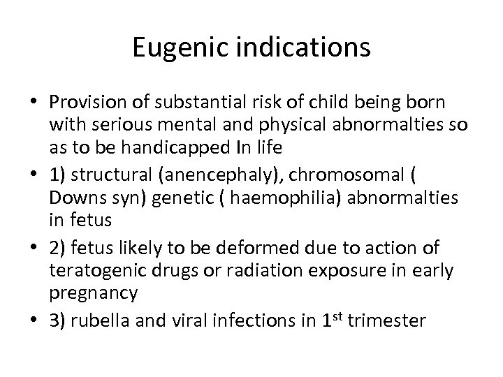 Eugenic indications • Provision of substantial risk of child being born with serious mental and physical abnormalties so as to be handicapped In life • 1) structural (anencephaly), chromosomal ( Downs syn) genetic ( haemophilia) abnormalties in fetus • 2) fetus likely to be deformed due to action of teratogenic drugs or radiation exposure in early pregnancy • 3) rubella and viral infections in 1 st trimester