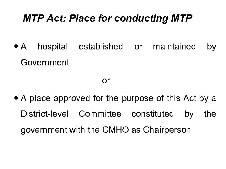 MTP Act: Place for conducting MTP A hospital established or maintained by Government or A place approved for the purpose of this Act by a District-level Committee constituted by government with the CMHO as Chairperson the