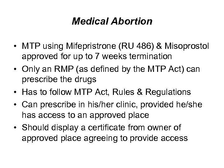 Medical Abortion • MTP using Mifepristrone (RU 486) & Misoprostol approved for up to 7 weeks termination • Only an RMP (as defined by the MTP Act) can prescribe the drugs • Has to follow MTP Act, Rules & Regulations • Can prescribe in his/her clinic, provided he/she has access to an approved place • Should display a certificate from owner of approved place agreeing to provide access