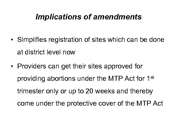 Implications of amendments • Simplifies registration of sites which can be done at district level now • Providers can get their sites approved for providing abortions under the MTP Act for 1 st trimester only or up to 20 weeks and thereby come under the protective cover of the MTP Act