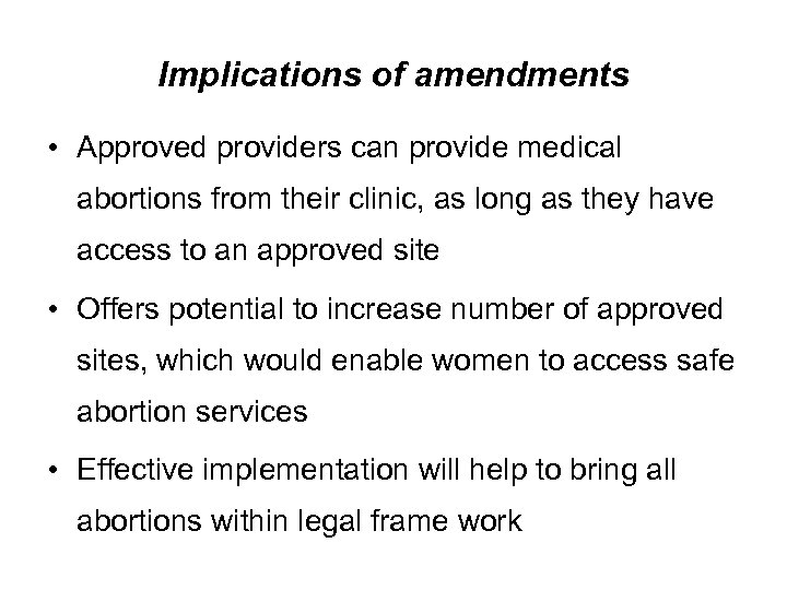 Implications of amendments • Approved providers can provide medical abortions from their clinic, as long as they have access to an approved site • Offers potential to increase number of approved sites, which would enable women to access safe abortion services • Effective implementation will help to bring all abortions within legal frame work