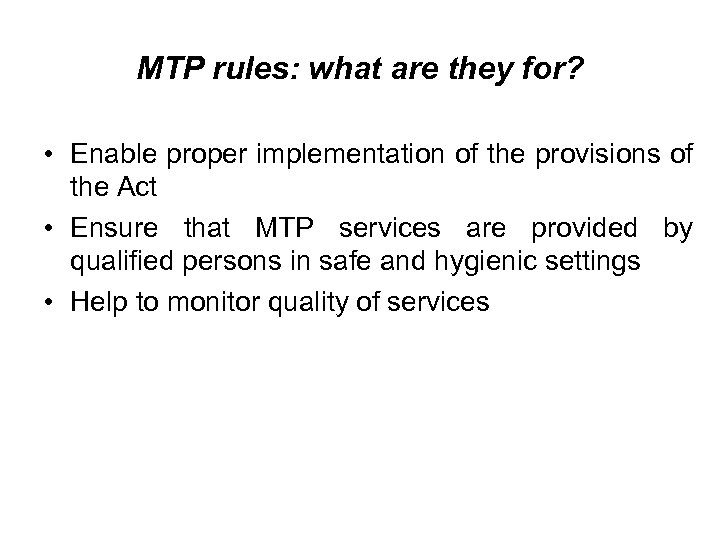 MTP rules: what are they for? • Enable proper implementation of the provisions of the Act • Ensure that MTP services are provided by qualified persons in safe and hygienic settings • Help to monitor quality of services