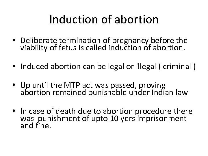 Induction of abortion • Deliberate termination of pregnancy before the viability of fetus is called induction of abortion. • Induced abortion can be legal or illegal ( criminal ) • Up until the MTP act was passed, proving abortion remained punishable under Indian law • In case of death due to abortion procedure there was punishment of upto 10 yers imprisonment and fine.