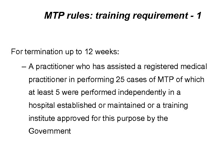 MTP rules: training requirement - 1 For termination up to 12 weeks: – A practitioner who has assisted a registered medical practitioner in performing 25 cases of MTP of which at least 5 were performed independently in a hospital established or maintained or a training institute approved for this purpose by the Government
