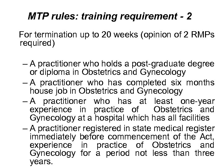 MTP rules: training requirement - 2 For termination up to 20 weeks (opinion of 2 RMPs required) – A practitioner who holds a post-graduate degree or diploma in Obstetrics and Gynecology – A practitioner who has completed six months house job in Obstetrics and Gynecology – A practitioner who has at least one-year experience in practice of Obstetrics and Gynecology at a hospital which has all facilities – A practitioner registered in state medical register immediately before commencement of the Act, experience in practice of Obstetrics and Gynecology for a period not less than three years.