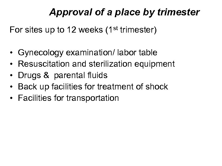 Approval of a place by trimester For sites up to 12 weeks (1 st trimester) • • • Gynecology examination/ labor table Resuscitation and sterilization equipment Drugs & parental fluids Back up facilities for treatment of shock Facilities for transportation