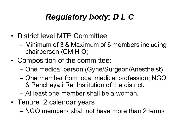 Regulatory body: D L C • District level MTP Committee – Minimum of 3 & Maximum of 5 members including chairperson (CM H O) • Composition of the committee: – One medical person (Gyne/Surgeon/Anestheist) – One member from local medical profession; NGO & Panchayati Raj Institution of the district. – At least one member shall be a woman. • Tenure 2 calendar years – NGO members shall not have more than 2 terms