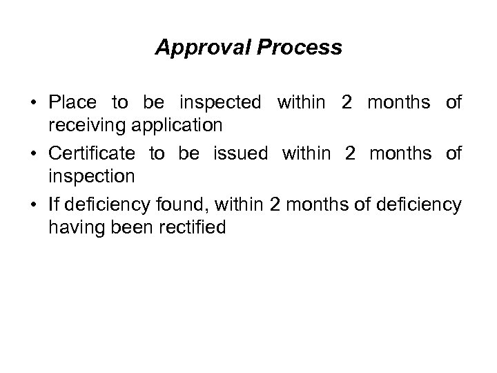Approval Process • Place to be inspected within 2 months of receiving application • Certificate to be issued within 2 months of inspection • If deficiency found, within 2 months of deficiency having been rectified