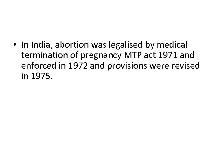 • In India, abortion was legalised by medical termination of pregnancy MTP act 1971 and enforced in 1972 and provisions were revised in 1975.