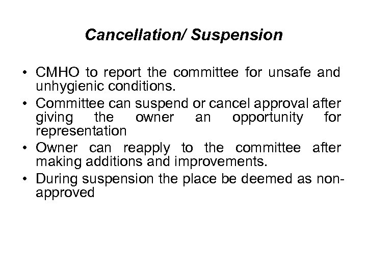 Cancellation/ Suspension • CMHO to report the committee for unsafe and unhygienic conditions. • Committee can suspend or cancel approval after giving the owner an opportunity for representation • Owner can reapply to the committee after making additions and improvements. • During suspension the place be deemed as nonapproved