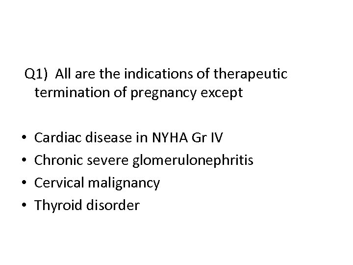 Q 1) All are the indications of therapeutic termination of pregnancy except • • Cardiac disease in NYHA Gr IV Chronic severe glomerulonephritis Cervical malignancy Thyroid disorder