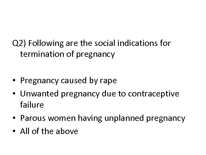 Q 2) Following are the social indications for termination of pregnancy • Pregnancy caused by rape • Unwanted pregnancy due to contraceptive failure • Parous women having unplanned pregnancy • All of the above