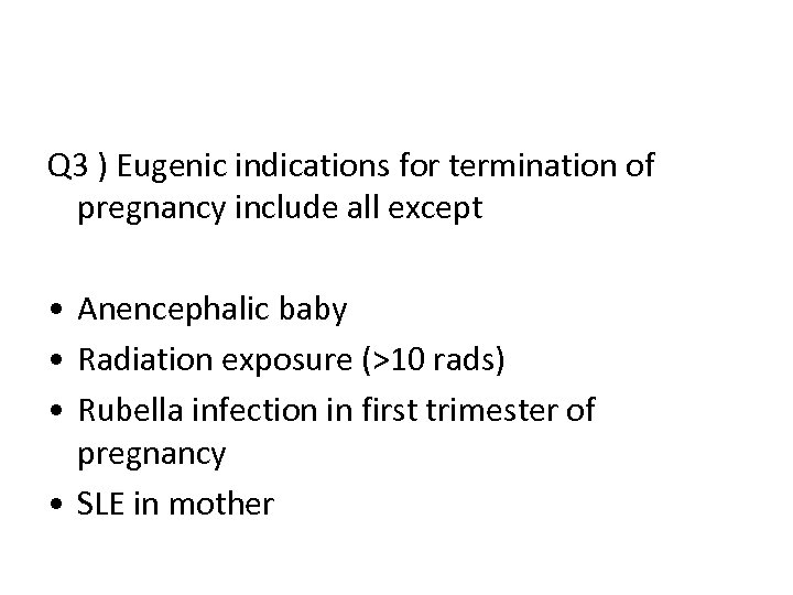 Q 3 ) Eugenic indications for termination of pregnancy include all except • Anencephalic baby • Radiation exposure (>10 rads) • Rubella infection in first trimester of pregnancy • SLE in mother