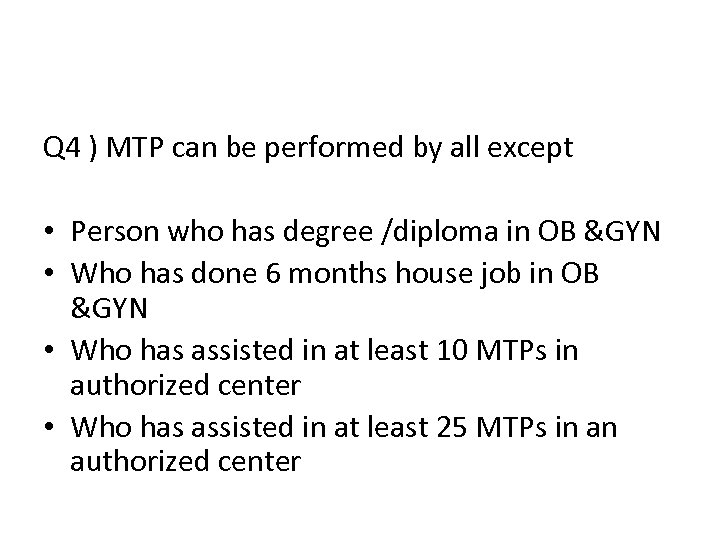 Q 4 ) MTP can be performed by all except • Person who has degree /diploma in OB &GYN • Who has done 6 months house job in OB &GYN • Who has assisted in at least 10 MTPs in authorized center • Who has assisted in at least 25 MTPs in an authorized center
