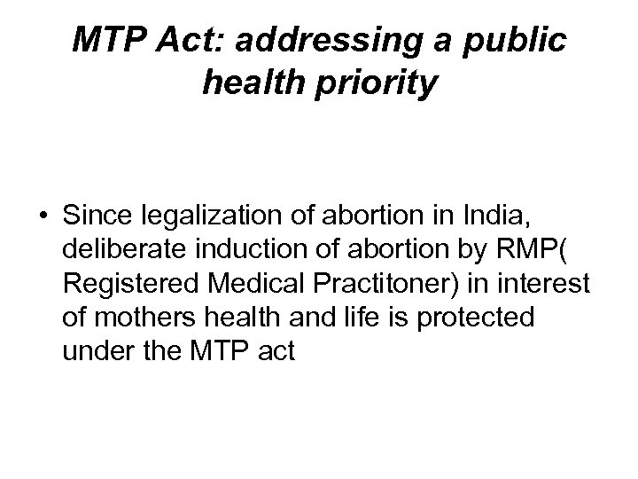 MTP Act: addressing a public health priority • Since legalization of abortion in India, deliberate induction of abortion by RMP( Registered Medical Practitoner) in interest of mothers health and life is protected under the MTP act