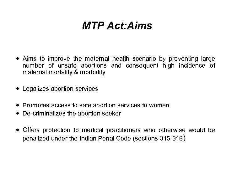 MTP Act: Aims to improve the maternal health scenario by preventing large number of unsafe abortions and consequent high incidence of maternal mortality & morbidity Legalizes abortion services Promotes access to safe abortion services to women De-criminalizes the abortion seeker Offers protection to medical practitioners who otherwise would be penalized under the Indian Penal Code (sections 315 -316)
