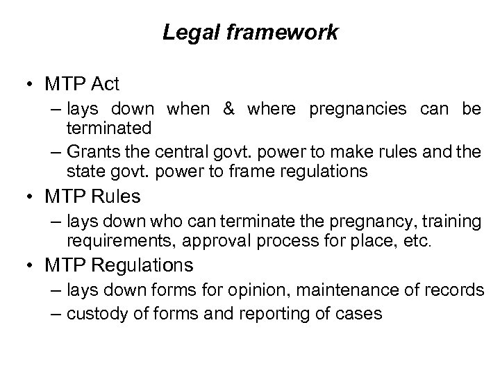 Legal framework • MTP Act – lays down when & where pregnancies can be terminated – Grants the central govt. power to make rules and the state govt. power to frame regulations • MTP Rules – lays down who can terminate the pregnancy, training requirements, approval process for place, etc. • MTP Regulations – lays down forms for opinion, maintenance of records – custody of forms and reporting of cases