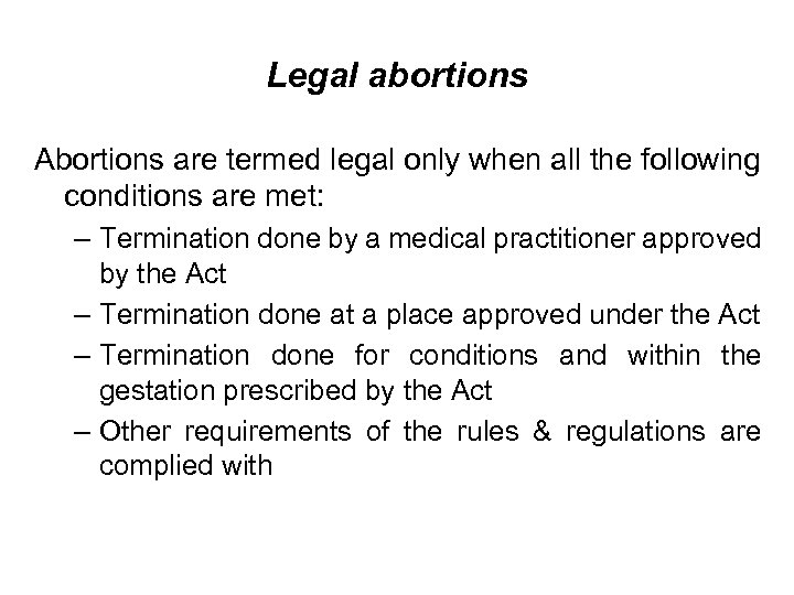 Legal abortions Abortions are termed legal only when all the following conditions are met: – Termination done by a medical practitioner approved by the Act – Termination done at a place approved under the Act – Termination done for conditions and within the gestation prescribed by the Act – Other requirements of the rules & regulations are complied with