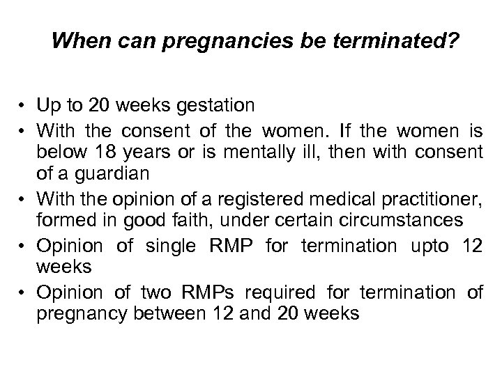 When can pregnancies be terminated? • Up to 20 weeks gestation • With the consent of the women. If the women is below 18 years or is mentally ill, then with consent of a guardian • With the opinion of a registered medical practitioner, formed in good faith, under certain circumstances • Opinion of single RMP for termination upto 12 weeks • Opinion of two RMPs required for termination of pregnancy between 12 and 20 weeks