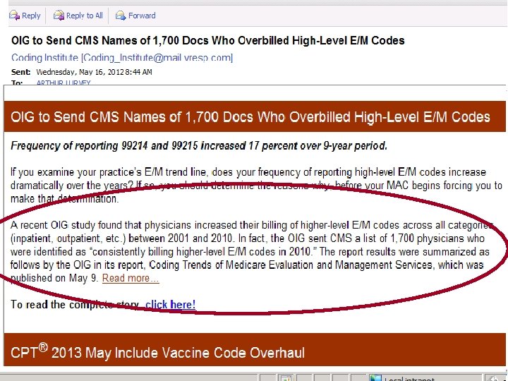 LOOKING AT MORE CLAIMS • Electronic Records Must be kept up to date for any visit • Concurrent illness must be concurrent & significant • Decision Making – Helpful if explained / listed / or documented – Important to list changes in care or diagnoses – Lab review should be included if records asked for in a review – Excess verbiage on some EHR still does not give extra value Get me outta here