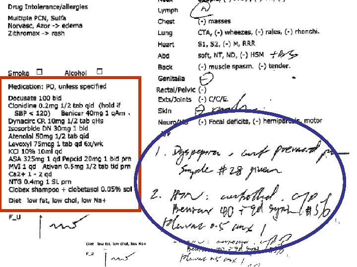EMR PROBLEMS • • • Cloning: cutting and pasting each visit Medical necessity of level of service Inconsistency of records: Hx, ROS, Exam “Regular” or “follow up” visits Documentation of individual visit uniqueness for that day • Documentation of decision making • Activeness and duplication of chronic problems and meds in list • Signatures, signatures
