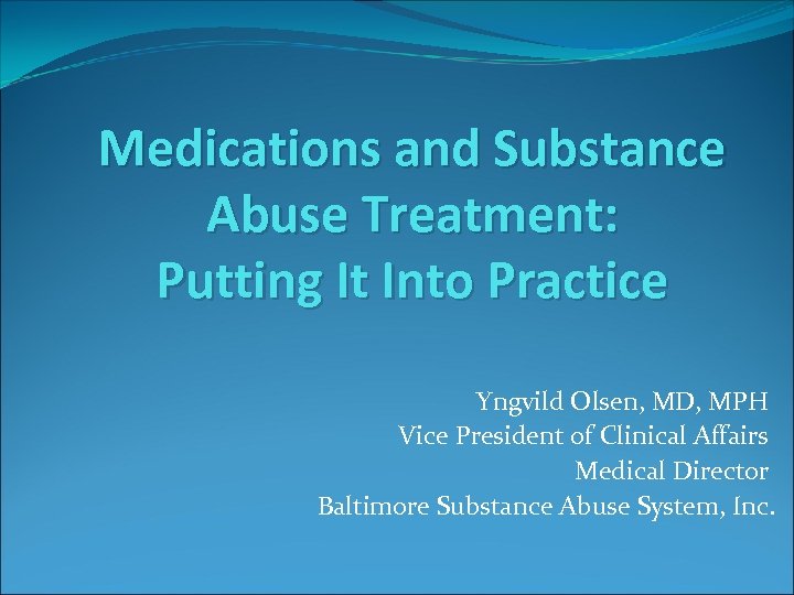 Medications and Substance Abuse Treatment: Putting It Into Practice Yngvild Olsen, MD, MPH Vice President of Clinical Affairs Medical Director Baltimore Substance Abuse System, Inc.
