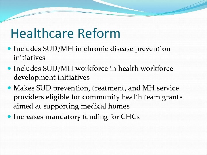 Healthcare Reform Includes SUD/MH in chronic disease prevention initiatives Includes SUD/MH workforce in health workforce development initiatives Makes SUD prevention, treatment, and MH service providers eligible for community health team grants aimed at supporting medical homes Increases mandatory funding for CHCs