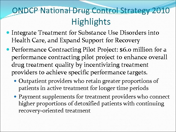ONDCP National Drug Control Strategy 2010 Highlights Integrate Treatment for Substance Use Disorders into Health Care, and Expand Support for Recovery Performance Contracting Pilot Project: $6. 0 million for a performance contracting pilot project to enhance overall drug treatment quality by incentivizing treatment providers to achieve specific performance targets. Outpatient providers who retain greater proportions of patients in active treatment for longer time periods Payment supplements for treatment providers who connect higher proportions of detoxified patients with continuing recovery‐oriented treatment