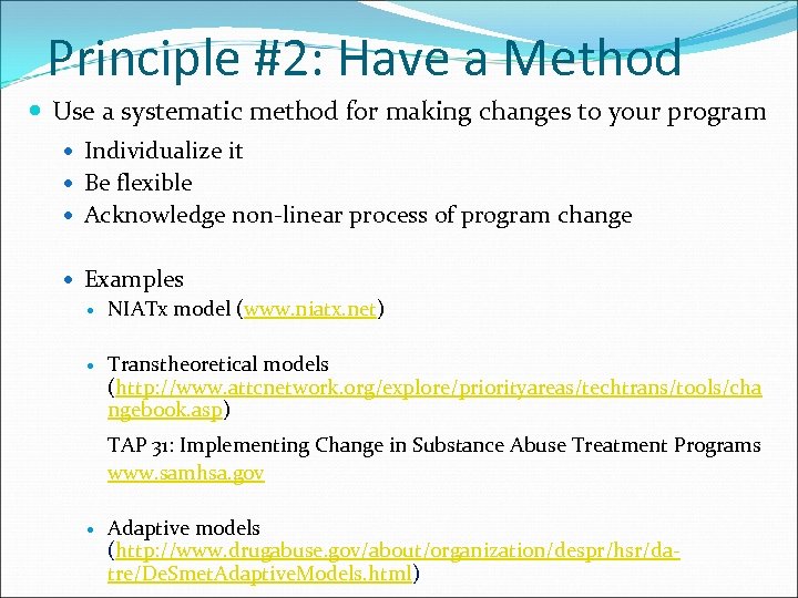 Principle #2: Have a Method Use a systematic method for making changes to your program Individualize it Be flexible Acknowledge non‐linear process of program change Examples NIATx model (www. niatx. net) Transtheoretical models (http: //www. attcnetwork. org/explore/priorityareas/techtrans/tools/cha ngebook. asp) TAP 31: Implementing Change in Substance Abuse Treatment Programs www. samhsa. gov Adaptive models (http: //www. drugabuse. gov/about/organization/despr/hsr/da‐ tre/De. Smet. Adaptive. Models. html)