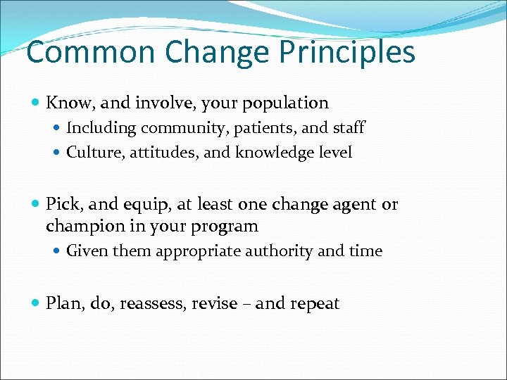 Common Change Principles Know, and involve, your population Including community, patients, and staff Culture, attitudes, and knowledge level Pick, and equip, at least one change agent or champion in your program Given them appropriate authority and time Plan, do, reassess, revise – and repeat