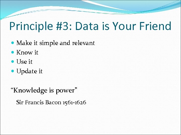 Principle #3: Data is Your Friend Make it simple and relevant Know it Use it Update it “Knowledge is power” Sir Francis Bacon 1561‐ 1626
