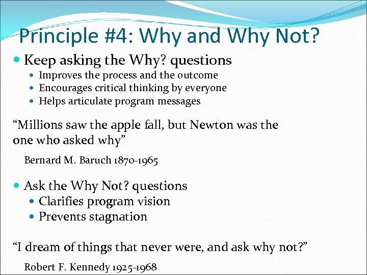 Principle #4: Why and Why Not? Keep asking the Why? questions Improves the process and the outcome Encourages critical thinking by everyone Helps articulate program messages “Millions saw the apple fall, but Newton was the one who asked why” Bernard M. Baruch 1870‐ 1965 Ask the Why Not? questions Clarifies program vision Prevents stagnation “I dream of things that never were, and ask why not? ” Robert F. Kennedy 1925‐ 1968