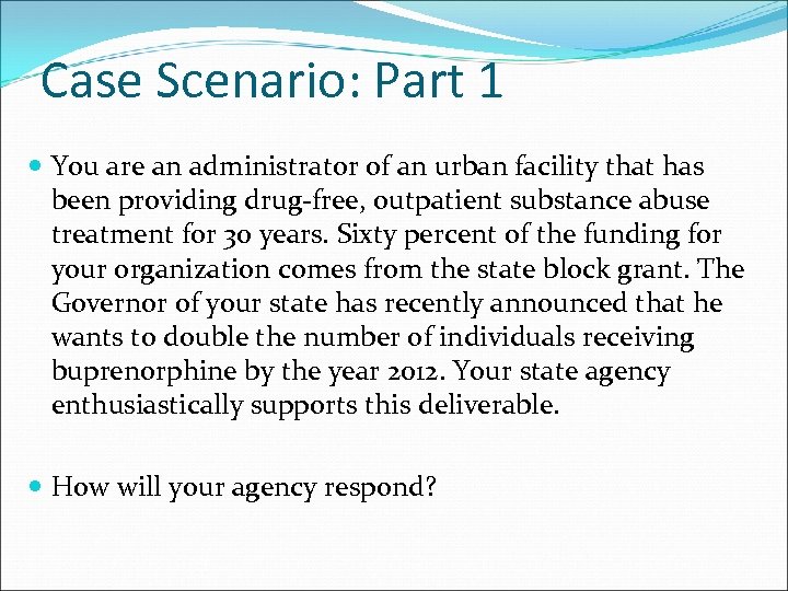 Case Scenario: Part 1 You are an administrator of an urban facility that has been providing drug‐free, outpatient substance abuse treatment for 30 years. Sixty percent of the funding for your organization comes from the state block grant. The Governor of your state has recently announced that he wants to double the number of individuals receiving buprenorphine by the year 2012. Your state agency enthusiastically supports this deliverable. How will your agency respond?