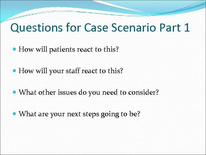Questions for Case Scenario Part 1 How will patients react to this? How will your staff react to this? What other issues do you need to consider? What are your next steps going to be?