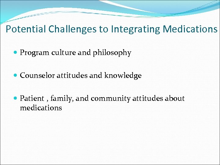 Potential Challenges to Integrating Medications Program culture and philosophy Counselor attitudes and knowledge Patient , family, and community attitudes about medications