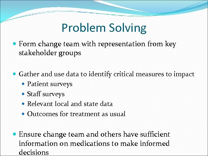 Problem Solving Form change team with representation from key stakeholder groups Gather and use data to identify critical measures to impact Patient surveys Staff surveys Relevant local and state data Outcomes for treatment as usual Ensure change team and others have sufficient information on medications to make informed decisions