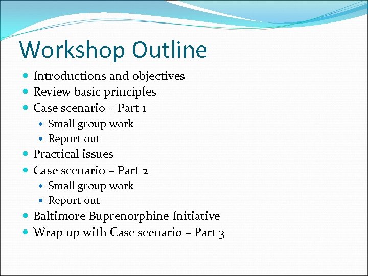 Workshop Outline Introductions and objectives Review basic principles Case scenario – Part 1 Small group work Report out Practical issues Case scenario – Part 2 Small group work Report out Baltimore Buprenorphine Initiative Wrap up with Case scenario – Part 3