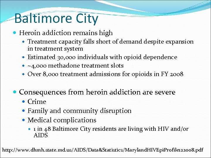 Baltimore City Heroin addiction remains high Treatment capacity falls short of demand despite expansion in treatment system Estimated 30, 000 individuals with opioid dependence ~4, 000 methadone treatment slots Over 8, 000 treatment admissions for opioids in FY 2008 Consequences from heroin addiction are severe Crime Family and community disruption Medical complications 1 in 48 Baltimore City residents are living with HIV and/or AIDS http: //www. dhmh. state. md. us/AIDS/Data&Statistics/Maryland. HIVEpi. Profile 122008. pdf