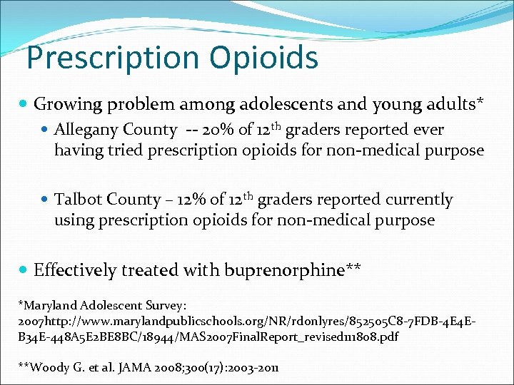 Prescription Opioids Growing problem among adolescents and young adults* Allegany County ‐‐ 20% of 12 th graders reported ever having tried prescription opioids for non‐medical purpose Talbot County – 12% of 12 th graders reported currently using prescription opioids for non‐medical purpose Effectively treated with buprenorphine** *Maryland Adolescent Survey: 2007 http: //www. marylandpublicschools. org/NR/rdonlyres/852505 C 8‐ 7 FDB‐ 4 E 4 E‐ B 34 E‐ 448 A 5 E 2 BE 8 BC/18944/MAS 2007 Final. Report_revised 111808. pdf **Woody G. et al. JAMA 2008; 300(17): 2003‐ 2011