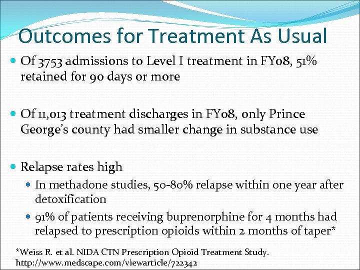 Outcomes for Treatment As Usual Of 3753 admissions to Level I treatment in FY 08, 51% retained for 90 days or more Of 11, 013 treatment discharges in FY 08, only Prince George’s county had smaller change in substance use Relapse rates high In methadone studies, 50‐ 80% relapse within one year after detoxification 91% of patients receiving buprenorphine for 4 months had relapsed to prescription opioids within 2 months of taper* *Weiss R. et al. NIDA CTN Prescription Opioid Treatment Study. http: //www. medscape. com/viewarticle/722342