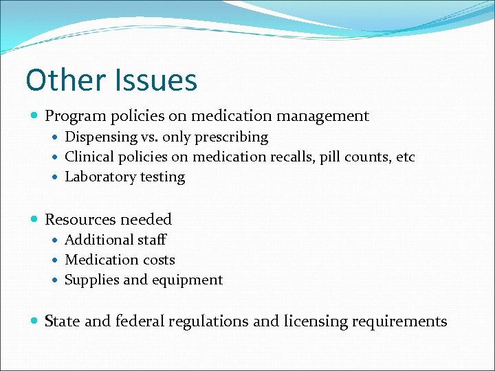 Other Issues Program policies on medication management Dispensing vs. only prescribing Clinical policies on medication recalls, pill counts, etc Laboratory testing Resources needed Additional staff Medication costs Supplies and equipment State and federal regulations and licensing requirements