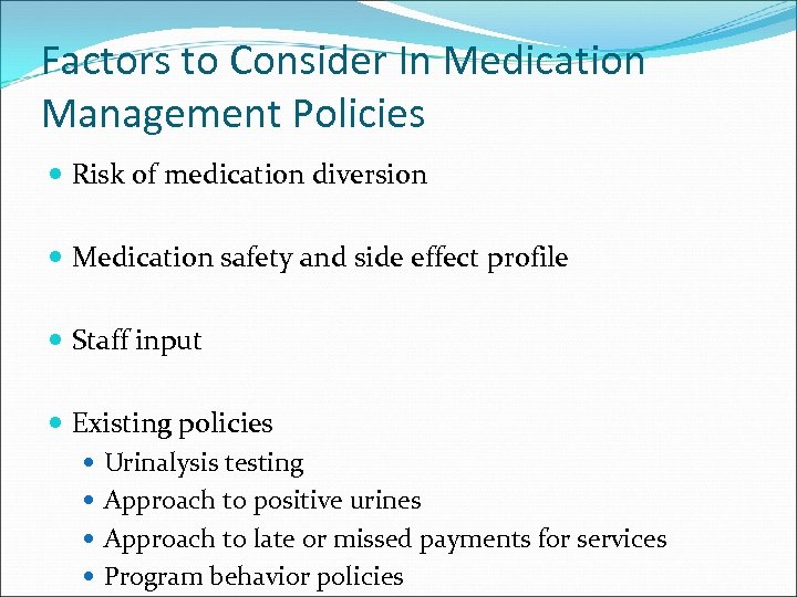 Factors to Consider In Medication Management Policies Risk of medication diversion Medication safety and side effect profile Staff input Existing policies Urinalysis testing Approach to positive urines Approach to late or missed payments for services Program behavior policies