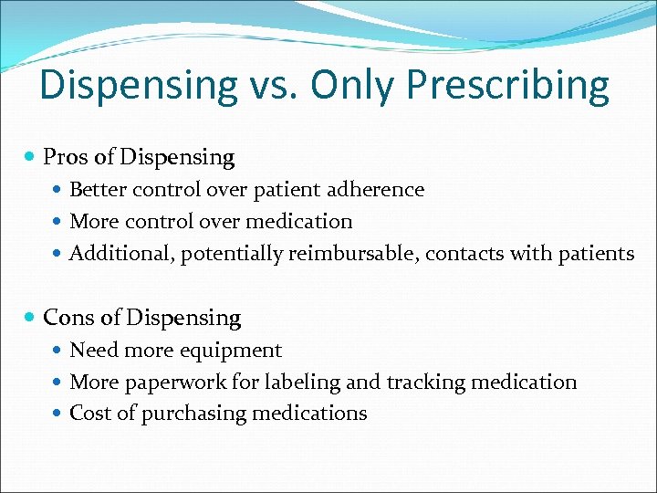 Dispensing vs. Only Prescribing Pros of Dispensing Better control over patient adherence More control over medication Additional, potentially reimbursable, contacts with patients Cons of Dispensing Need more equipment More paperwork for labeling and tracking medication Cost of purchasing medications