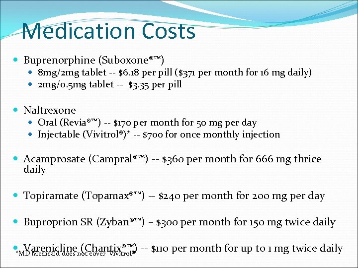 Medication Costs Buprenorphine (Suboxone®™) 8 mg/2 mg tablet ‐‐ $6. 18 per pill ($371 per month for 16 mg daily) 2 mg/0. 5 mg tablet ‐‐ $3. 35 per pill Naltrexone Oral (Revia®™) ‐‐ $170 per month for 50 mg per day Injectable (Vivitrol®)* ‐‐ $700 for once monthly injection Acamprosate (Campral®™) ‐‐ $360 per month for 666 mg thrice daily Topiramate (Topamax®™) ‐‐ $240 per month for 200 mg per day Buproprion SR (Zyban®™) – $300 per month for 150 mg twice daily Vareniclinenot cover Vivitrol® ‐‐ $110 per month for up to 1 mg twice daily (Chantix®™) *MD Medicaid does